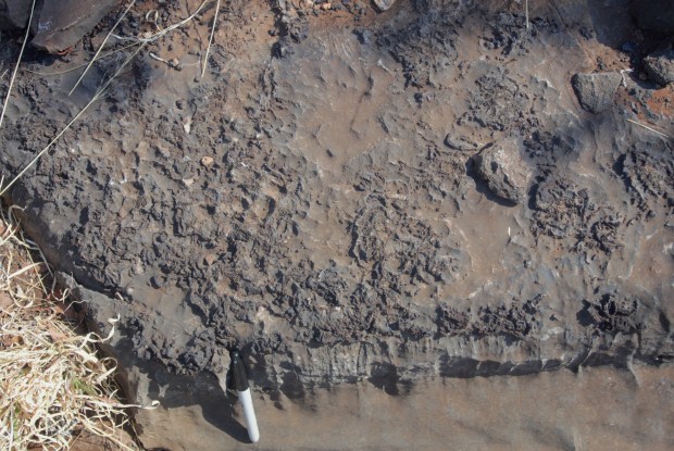 The above right image is a carbonate microbialite in the 2.5 billion year old Gamohaan formation on the Kaapvaal craton, South Africa. The ridges on its surface form as the carbonate weathers more rapidly than more resistant, partially silicified features composed of fossilized organic matter.