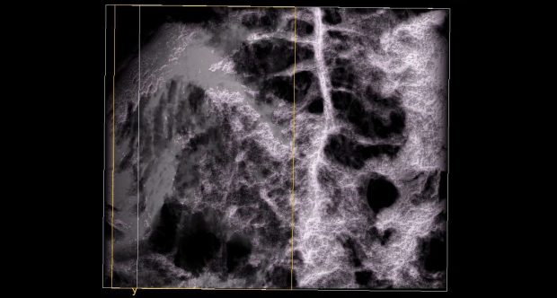 The image to the right is a 3D projection of the fossilized organic structures that were preserved within the carbonate microbialite in the picture directly above it. I study the morphology of these structures so that I can better understand how the microorganisms that formed them may have competed and/or cooperated for resources.